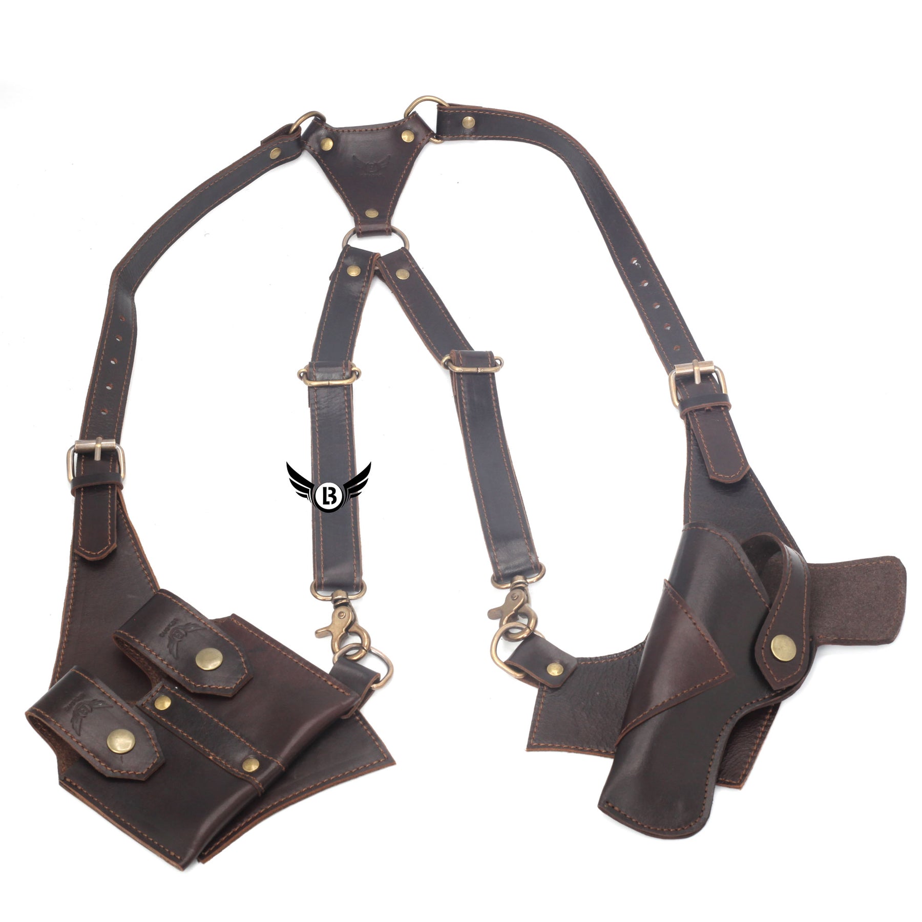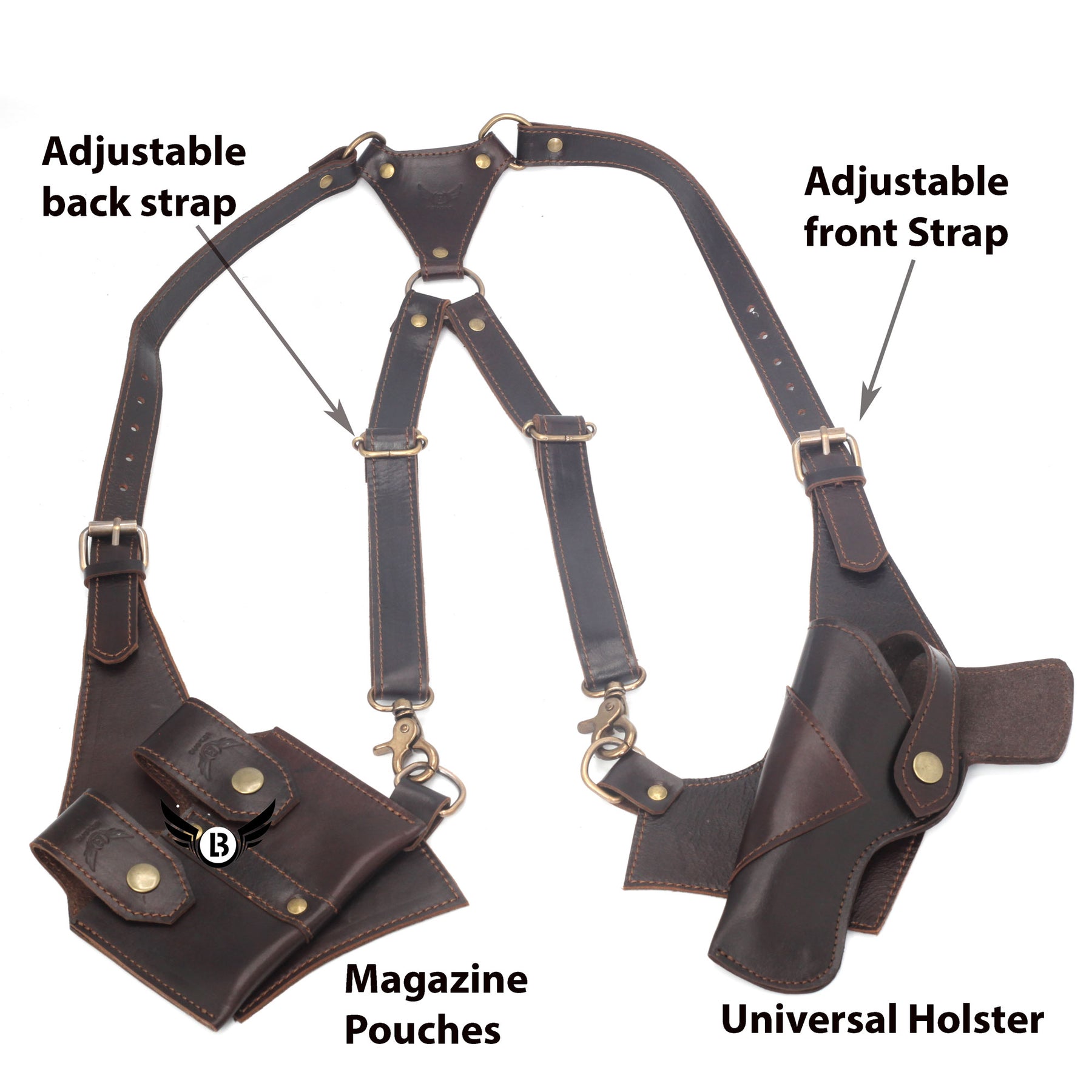 Introducing our Handmade, Universal, Leather Shoulder Holster Compatible all size of hand guns, Vertical Concealed Holster with Double Mag for right and left handers, Concealed Carry (Brown), the perfect accessory for your firearm. This holster is designed to provide maximum comfort and security while allowing you to carry your gun with ease. Crafted from premium quality, genuine leather, this holster is built to last and withstand the rigors of daily use. The adjustable shoulder strap allows you to find the perfect fit for your body type, ensuring that the holster stays in place even during strenuous activity. The holster features a vertical design, which makes it easy to conceal your gun under your clothing, making it ideal for both casual and professional settings. The holster is designed to accommodate all sizes of hand guns, including popular models such as Glock, Smith & Wesson, Springfield, and Ruger. It features a double magazine pouch, allowing you to carry an additional magazine with your firearm for added convenience. The holster also features a secure locking system, which ensures that your gun remains in place even when you are moving or engaging in physical activity. Whether you are a law enforcement officer, a concealed carry permit holder, or simply looking for a safe and reliable way to carry your gun, our Handmade, Universal, Leather Shoulder Holster Compatible all size of hand guns, Vertical Concealed Holster with Double Mag for right and left handers.