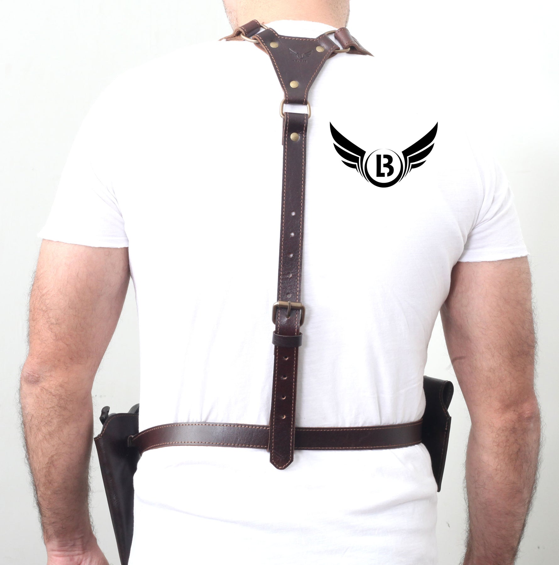 This is a handmade leather shoulder holster that is made of premium Cowhide leather. It is designed for shooters. It has a double magazine pouch .The holster has a snap closure and is fully lined for comfort. This is a high-quality, durable holster that is perfect for concealed carry.